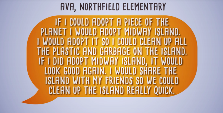 Hannah, Minster Elementary: If I could adopt a piece of the planet Earth I would want to adopt a place where there are people everywhere, like Florida or California. It might take some extra work to clean up all of the trash, but that means I could make a bigger difference with how healthy and clean are Earth could be.