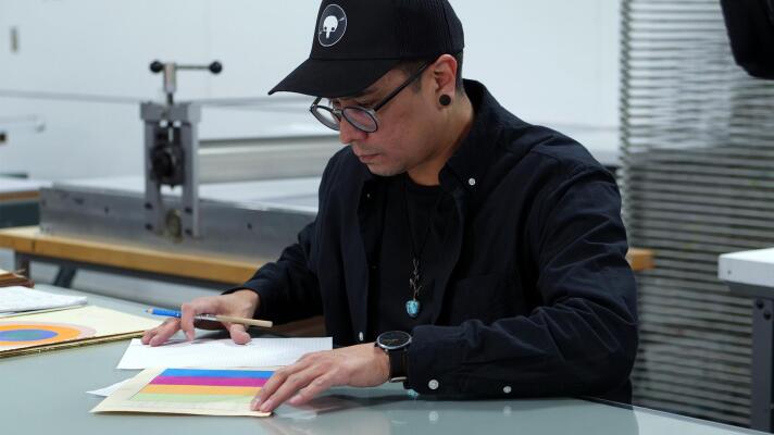 IAIA student Whisper Crow Dog & IAIA alumni on Terran Last Gun on ledger art